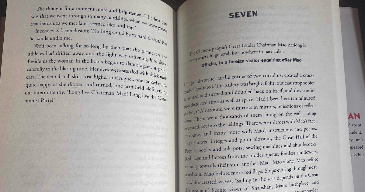“There were mirrors with Mao’s face, of course, and many more with Mao’s instructions and poems. They showed bridges and plum blossom, the Great Hall of the People, books and ink pots, sewing machines and shuttlecocks. Red flags and heroes from the model operas. Endless sunflowers, turning towards their sun: another Mao. Mao alone. Mao before a red sun. Mao before more red flags.”